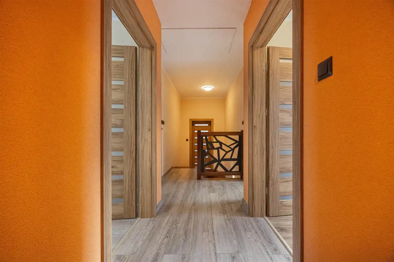- na piętrze znajdują się cztery sypialnie, dwie łazienki, garderoby oraz przestronny hall.