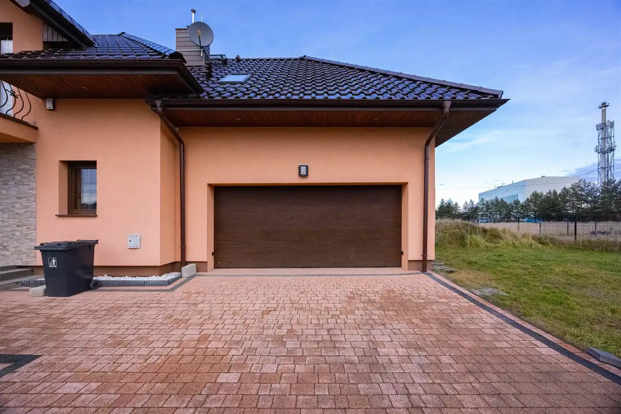 (klimatyzacja, rolety zewnętrzne, garaż dwustanowiskowy, trzy łazienki, kominek, garderoba)