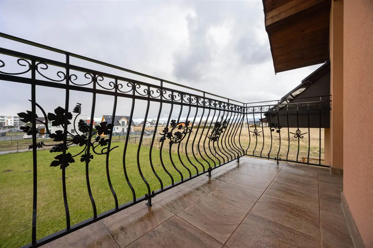 - solidne ogrodzenie – panelowe z przodu ozdobione ręcznie kutym żelazem.