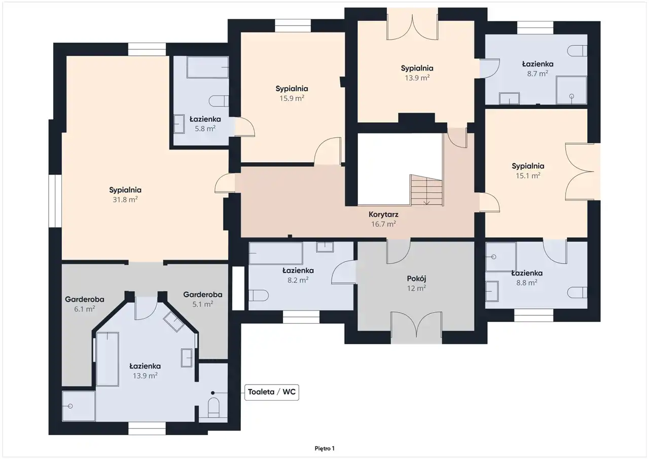 Duża sypialnia z gabinetem, łazienką i dwiema garderobami
