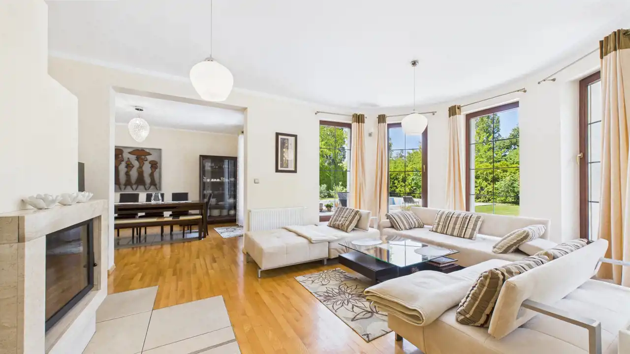 Przestronny, dobrze doświetlony salon z kominkiem i wyjściem do ogrodu