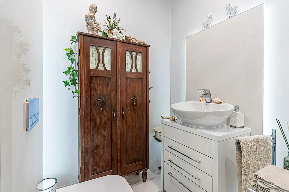Dodatkowo duża sypialnia z osobną łazienką, a w zasadzie to pokój kąpielowy w którym jest wanna, duża umywalka, toaleta i bidet z wysokiej jakości armatury, takie domowe SPA.