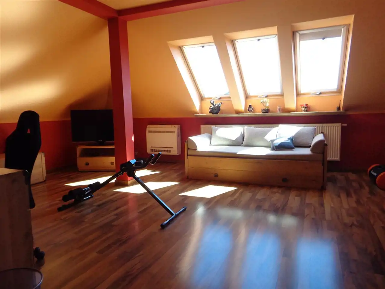 Na piętrze otwarta przestrzeń, w której urządzona jest profesjonalna siłownia z maszynami. Za budynkiem urządzony mały sad.