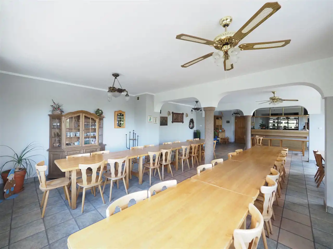Powierzchnia parteru wynosi 230 m2,w skład którego wchodzą: przedpokój (7 m2), hol z kominkiem (35 m2), garderoba (7 m2), salon (30 m2), łazienka (6,5 m2), duża kuchnia (19 m2), dwa pomieszczenia gospodarcze (3,6 m2, 7,5 m2), dwa WC (1,5 m2, 1,5 m2), pokój (24,4 m2), oraz duża sala (87 m2) z wyjściem na taras.