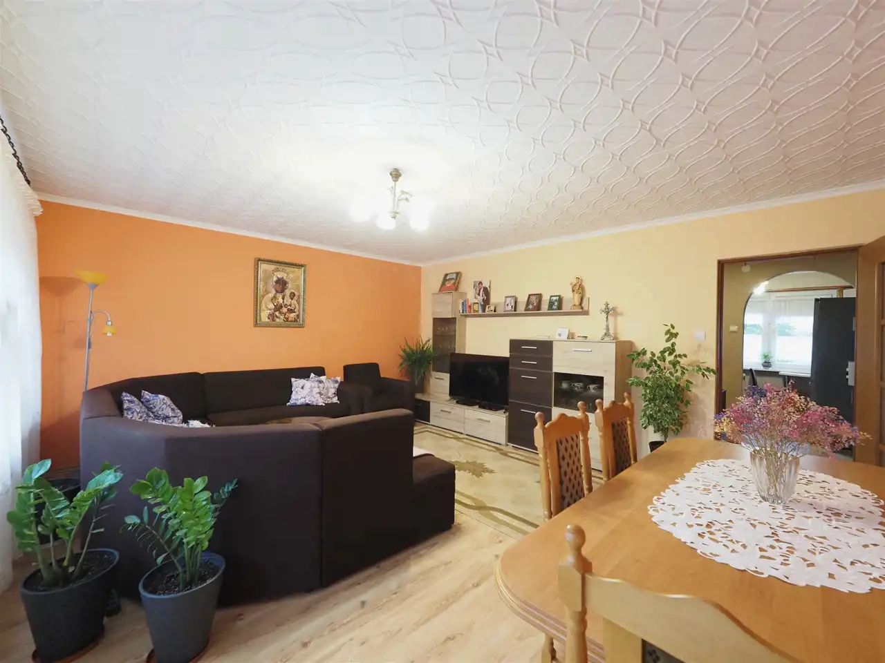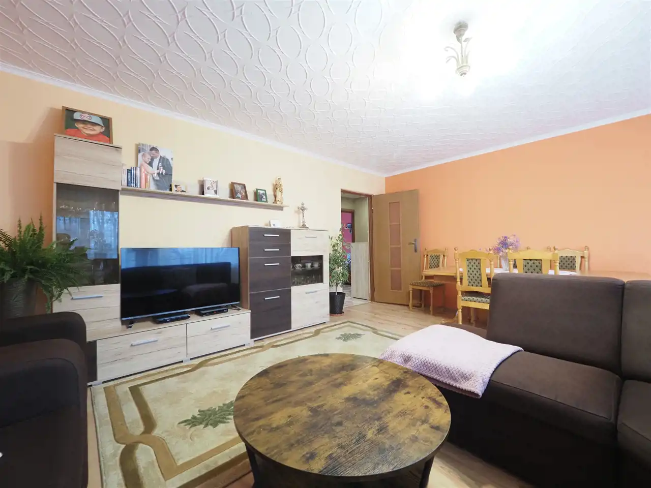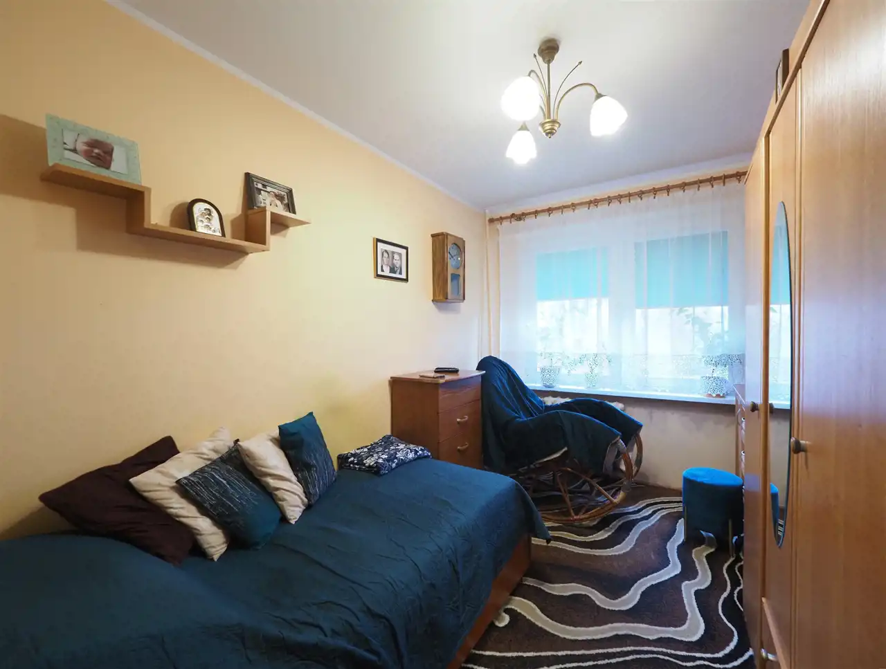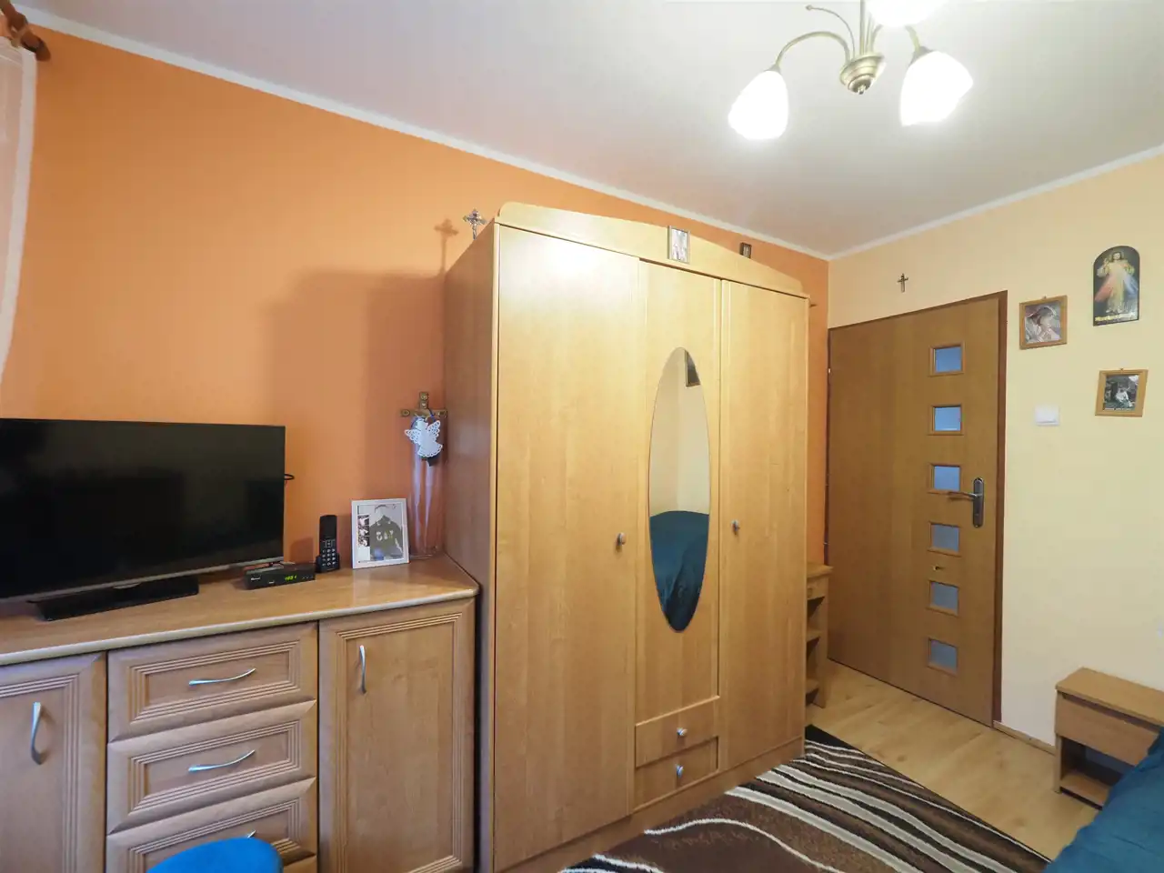 Mieszkanie usytuowane jest na parterze w dwupiętrowym bloku. Składa się z trzech pokoi (25m2, 10 m2, 8 m2), kuchni (8 m2), przedpokoju (6 m2), łazienki (2.6 m2), WC (1 m2), z największego z pokoi znajduje się wyjście na balkon (6 m2).