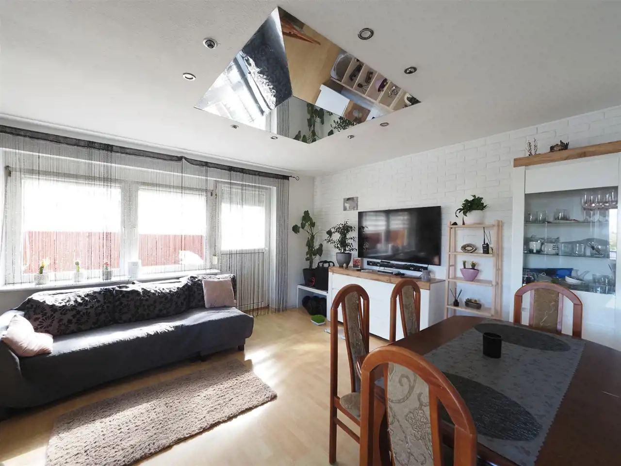 Mieszkanie usytuowane jest na pierwszym piętrze w budynku wielorodzinnym. Składa się z przestronnego salonu z aneksem kuchennym (24,2 m2) i wyjściem na duży, zadaszony taras (17 m2), 2 pokoi (10,8 m2, 4,5 m2), łazienki (4 m2) oraz korytarza (6 m2). Do mieszkania przynależy piwnica o powierzchni 10,36 m2. Dodatkowo do mieszkania przynależy część nieruchomości wspólnej którą właściciel zagospodarował jako parking oraz miejsce do wypoczynku.