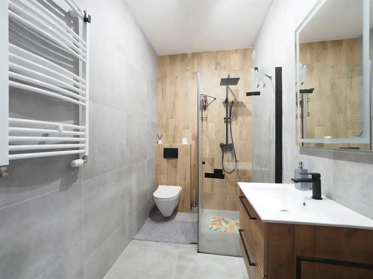 Mieszkanie wykończone w wysokim standardzie z najwyższej jakości materiałów. Podłogi wyłożone panelami i gresem, oświetlenie LED, okna plastikowe, nowoczesna zabudowa kuchenna. Wysokość pomieszczeń wynosi 2.73 cm, co pozwala na swobodną aranżację przestrzeni.