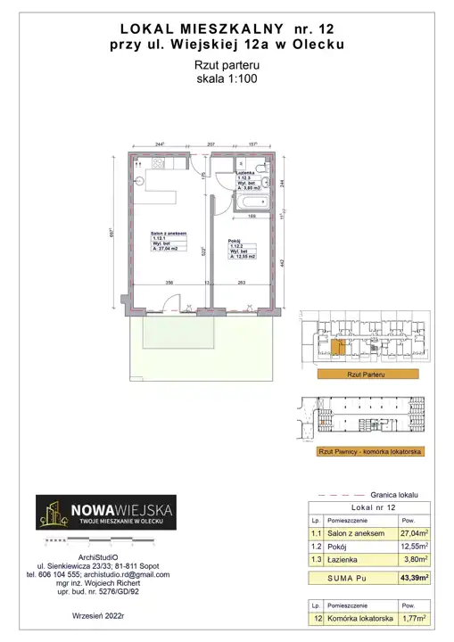 Lokal mieszkalny składa się z salonu z aneksem kuchennym (27,04 m2), sypialni (12,55 m2) i łazienki (3.80 m2). Do mieszkania przynależy taras o powierzchni 4,9 m2 i komórka lokatorska (1.77 m2). Ekspozycja okien w mieszkaniu skierowana jest w kierunku północno - zachodnim.