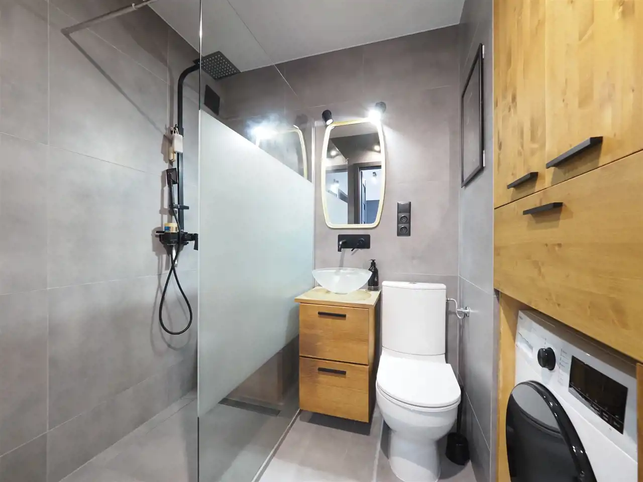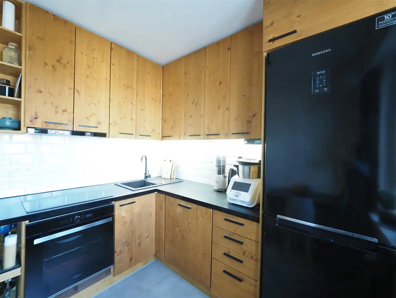 - nowoczesna kolorystyka drewna, bieli, czerni i szarości