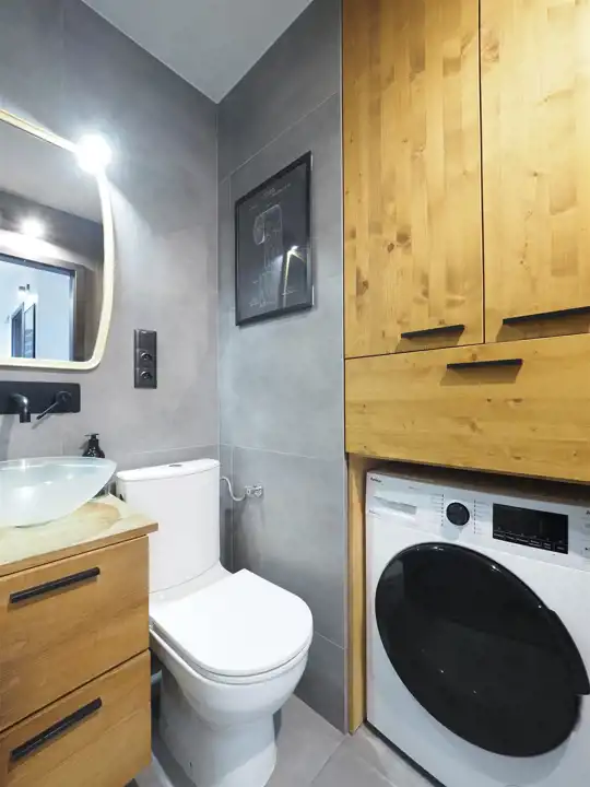 Zabudowa kuchni i łazienki wykonana na wymiar z drewna „pod sufit”, aby maksymalnie wykorzystać przestrzeń. W salonie i przedpokoju znajdują się szafy w zabudowie również z drewna na wymiar.