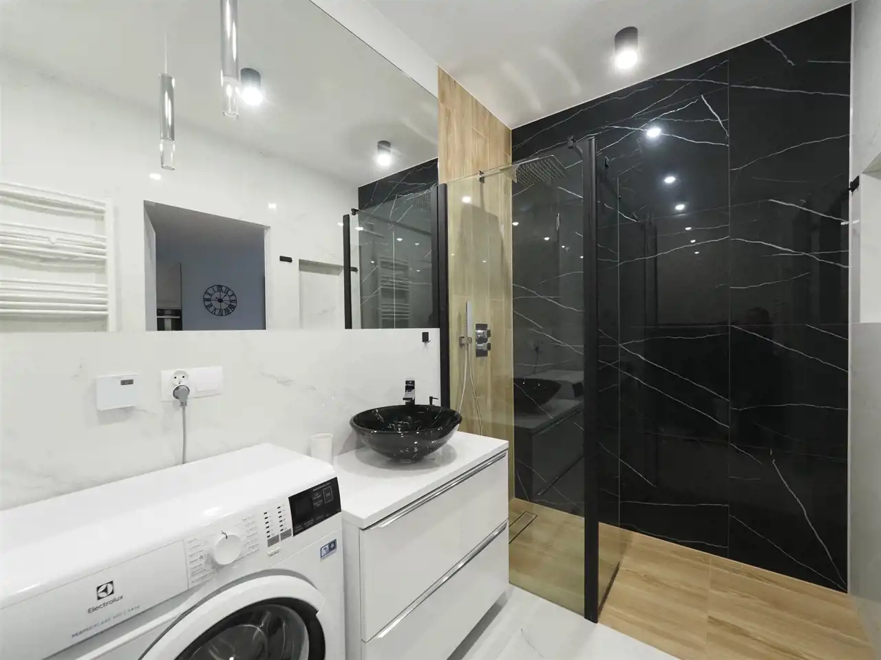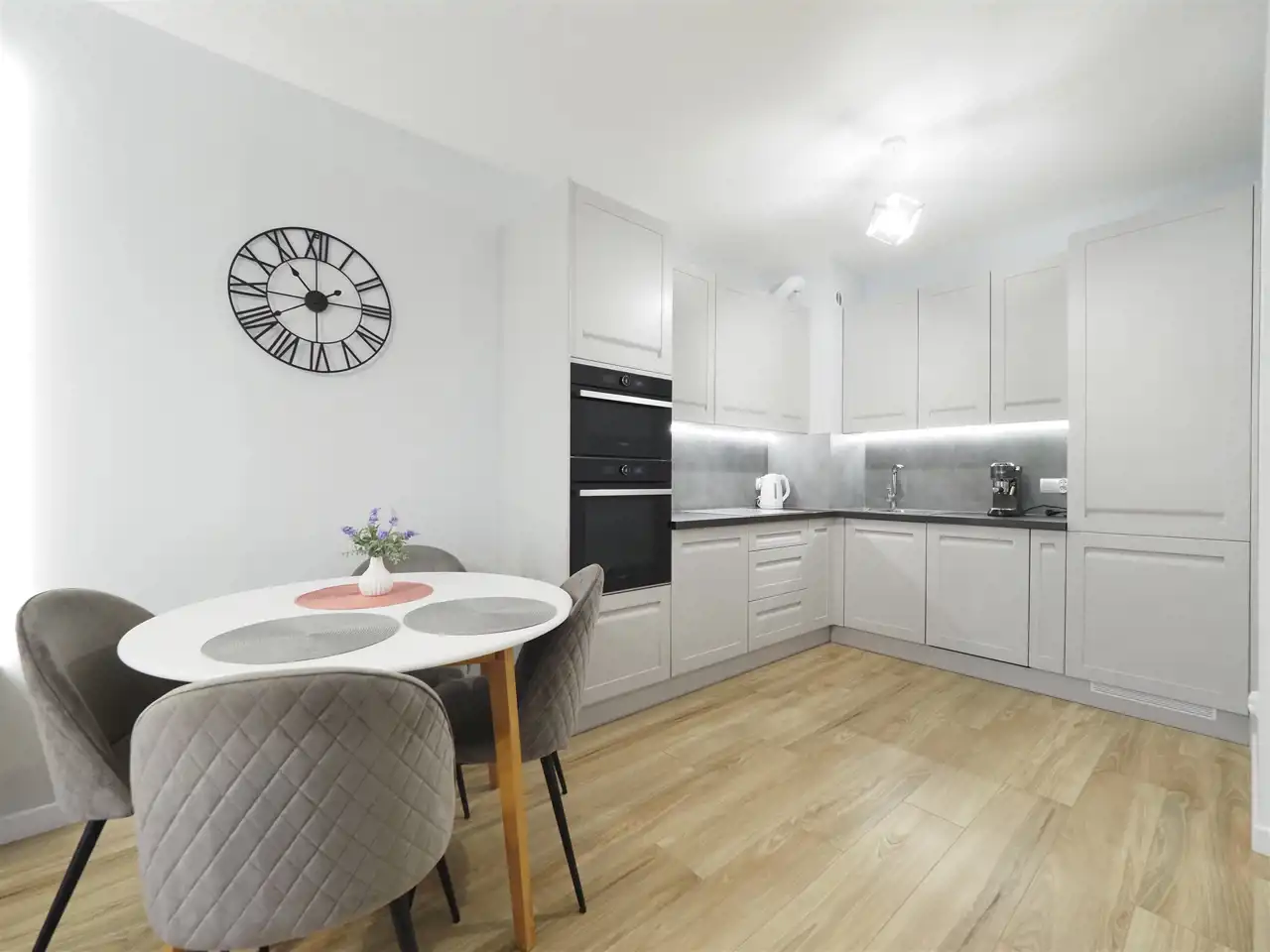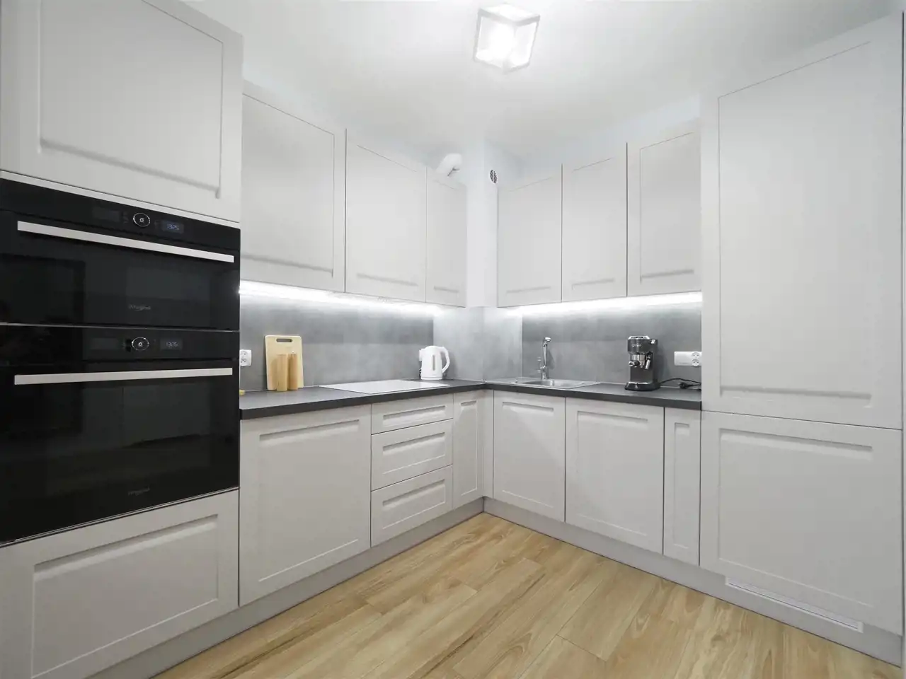 Mieszkanie wykończone w wysokim standardzie z wysokiej jakości materiałów. Podłogi w całym mieszkaniu zostały wyłożone terakotą, okna plastikowe z dodatkową wentylacją, nowoczesna zabudowa kuchenna. Układ pomieszczeń jest bardzo wygodny i rozkładowy. Pomieszczenia są dobrze doświetlone. Mieszkanie jest w pełni umeblowane, stała zabudowa wliczona jest w cenę mieszkania. Dodatkowo lokal wyposażony jest w videodomofon z dostępem do monitoringu.