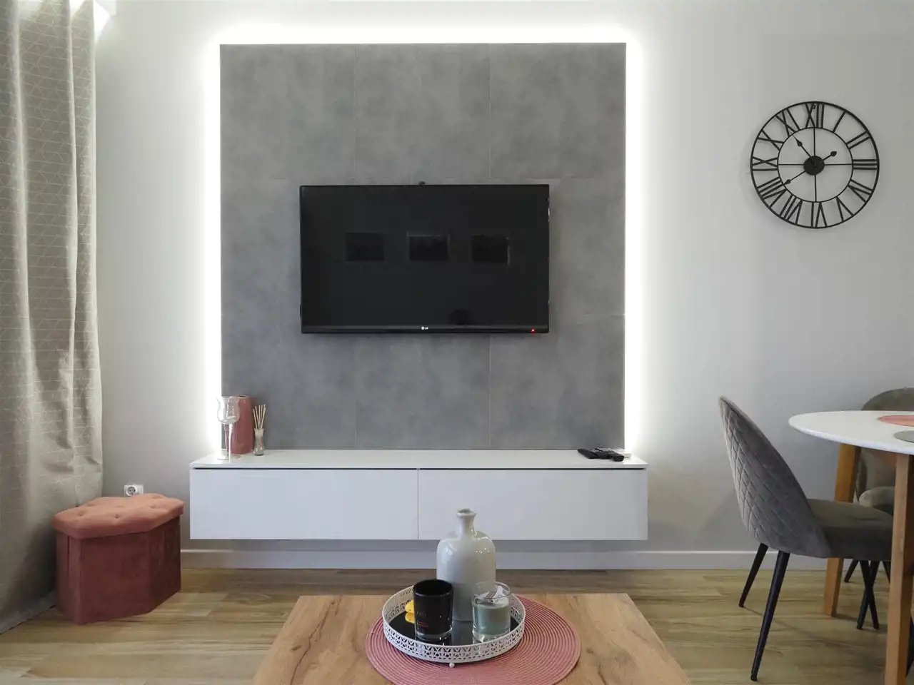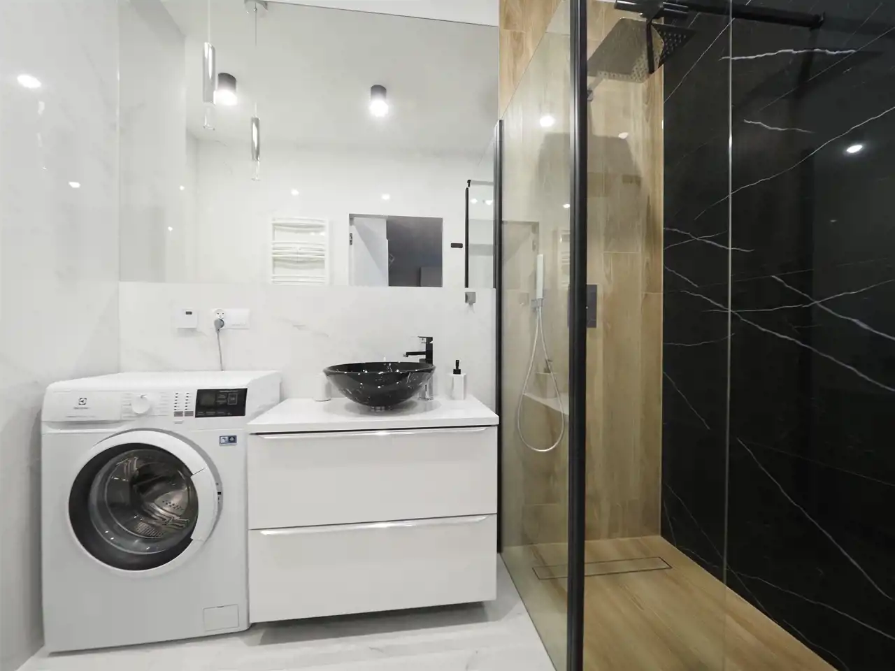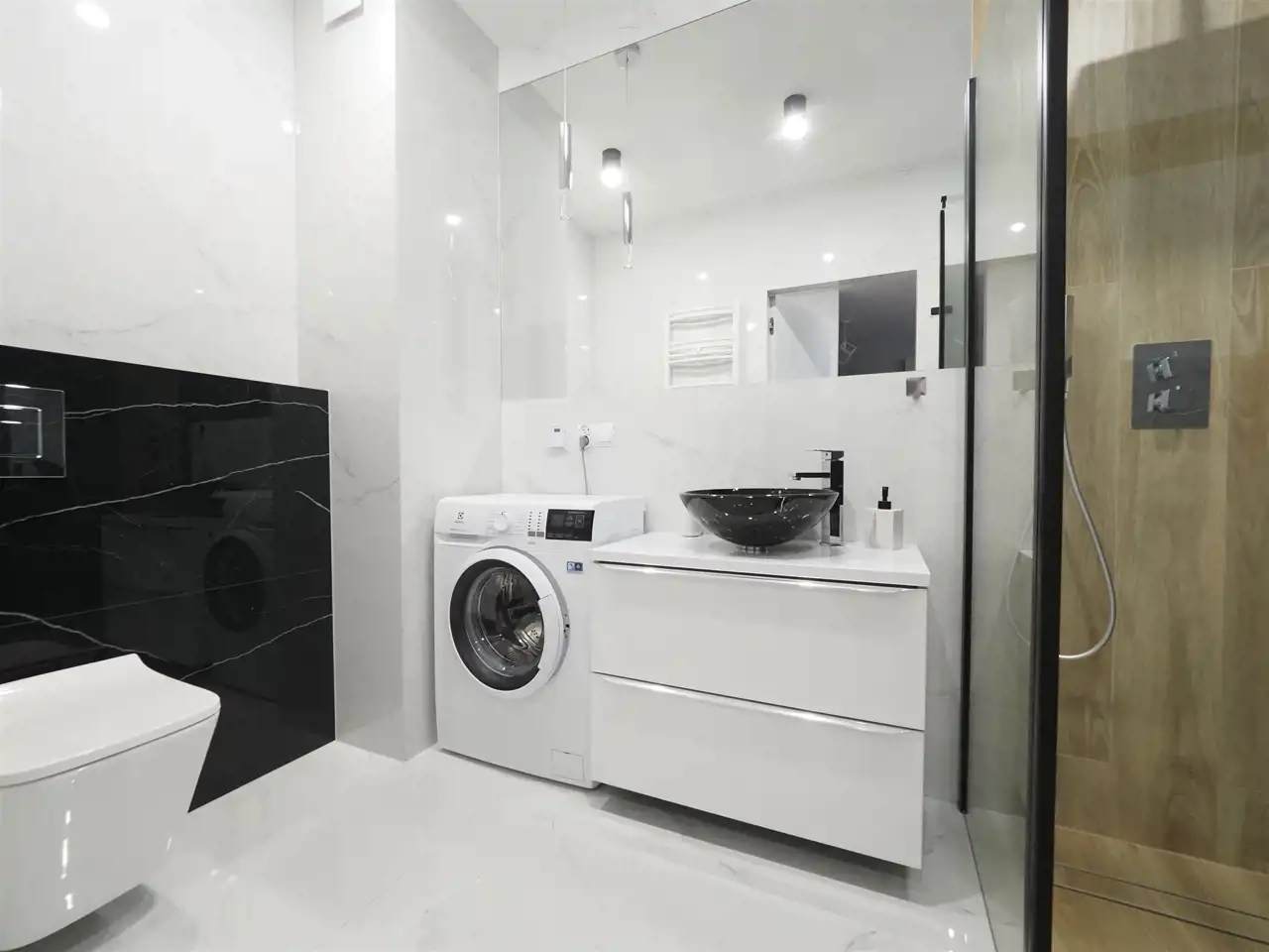 Mieszkanie wykończone w wysokim standardzie z wysokiej jakości materiałów. Podłogi w całym mieszkaniu zostały wyłożone terakotą, okna plastikowe z dodatkową wentylacją, nowoczesna zabudowa kuchenna. Układ pomieszczeń jest bardzo wygodny i rozkładowy. Pomieszczenia są dobrze doświetlone. Mieszkanie jest w pełni umeblowane, stała zabudowa wliczona jest w cenę mieszkania. Dodatkowo lokal wyposażony jest w videodomofon z dostępem do monitoringu.