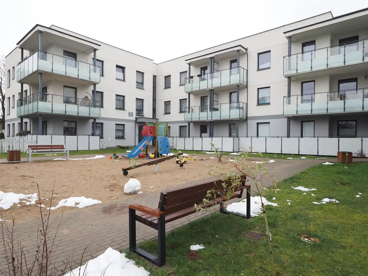 Teren wokół bloku jest ogrodzony i zagospodarowany – plac zabaw, oświetlenie, duży parking oraz monitoring.