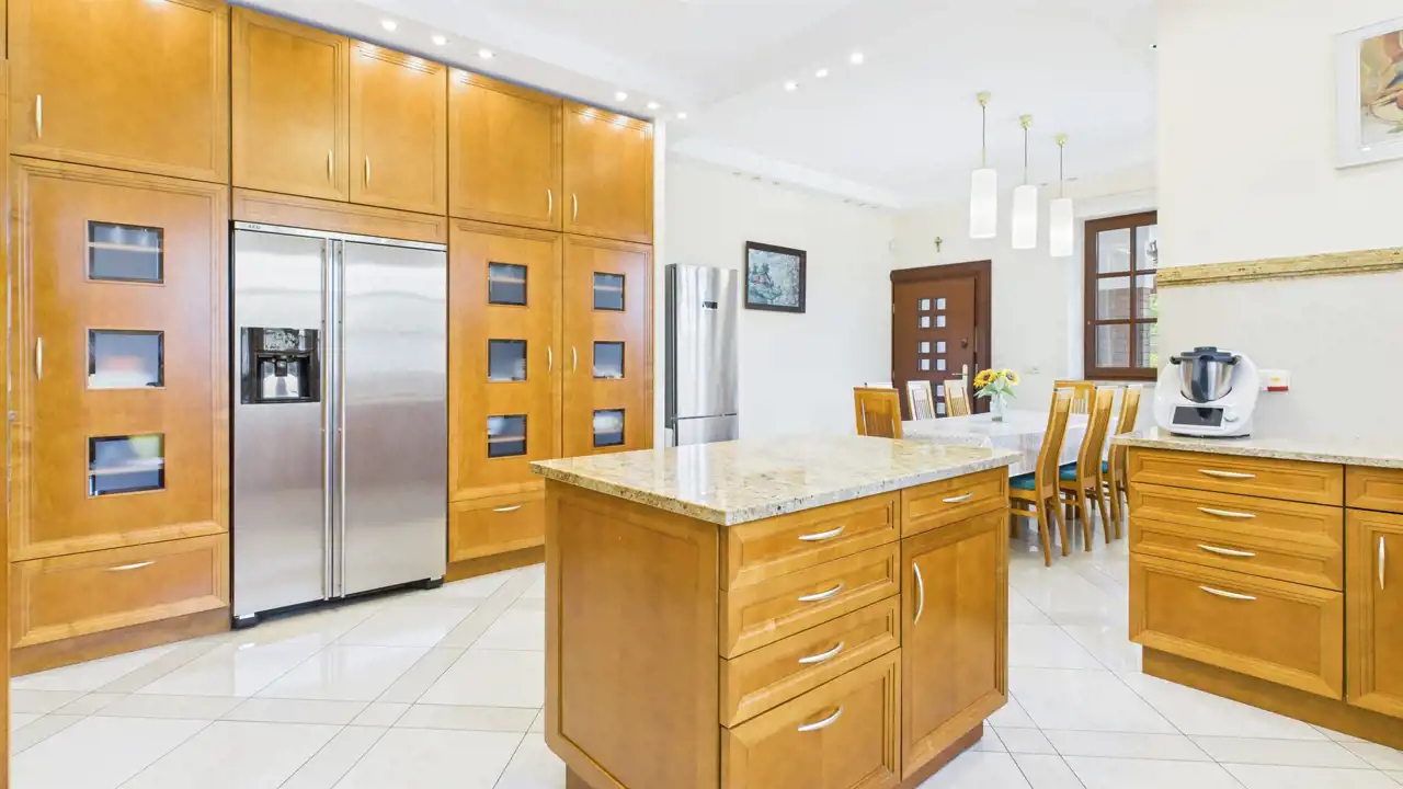 Ekskluzywna kuchnia z kamiennymi blatami i wysokiej klasy zabudową meblową,
