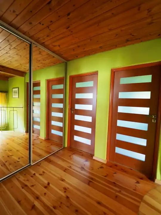 Materiał budowlany: cegła, dach płaski - blacha, okna drewniane firmy Sokółka. Podłogi - parter parkiet, piętro deska sosnowa, schody drewniane. Ogrzewanie centralne - piec gazowy dwufunkcyjny. Woda - elektryczny podgrzewacz wody.