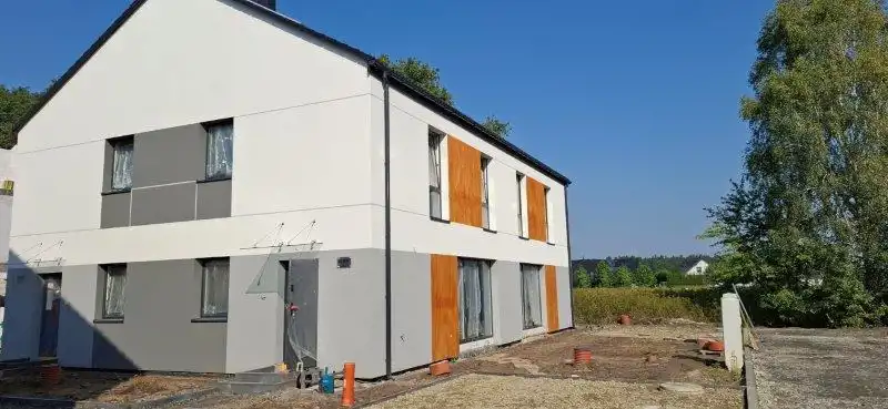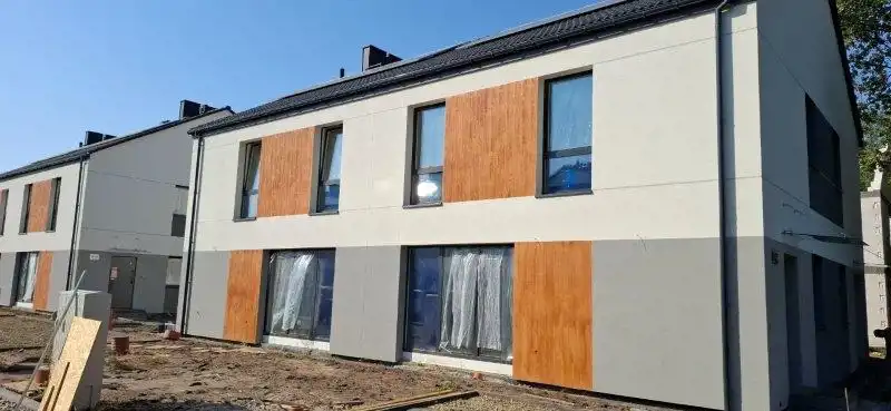 Schody żelbetowe na piętro. Schodki wysuwane na poddasze. Rolety w oknach na parterze (możliwość zamontowania rolet na piętrze jako opcja dodatkowa). Ogrodzenie panelowe . dojście do budynku oraz podjazdy z kostki brukowej/lub w systemie inovgreen.