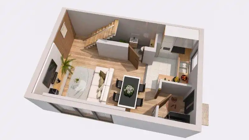 Projekt łączy zalety domu i mieszkania, poza świetnie zaplanowaną przestrzenią zapewniającą poczucie prywatności, spokój i bezpieczeństwo zapewnia kontakt z naturą.
