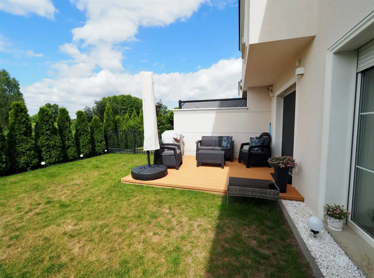 Działka o pow. 166 m2 ogrodzona, ze słonecznym tarasem z deski kompozytowej; podjazd wybrukowany. prywatne miejsce postojowe przed budynkiem. Garaż ogrzewany, na podłodze glazura; siła. MONITORING - 4 kamery+alarm.