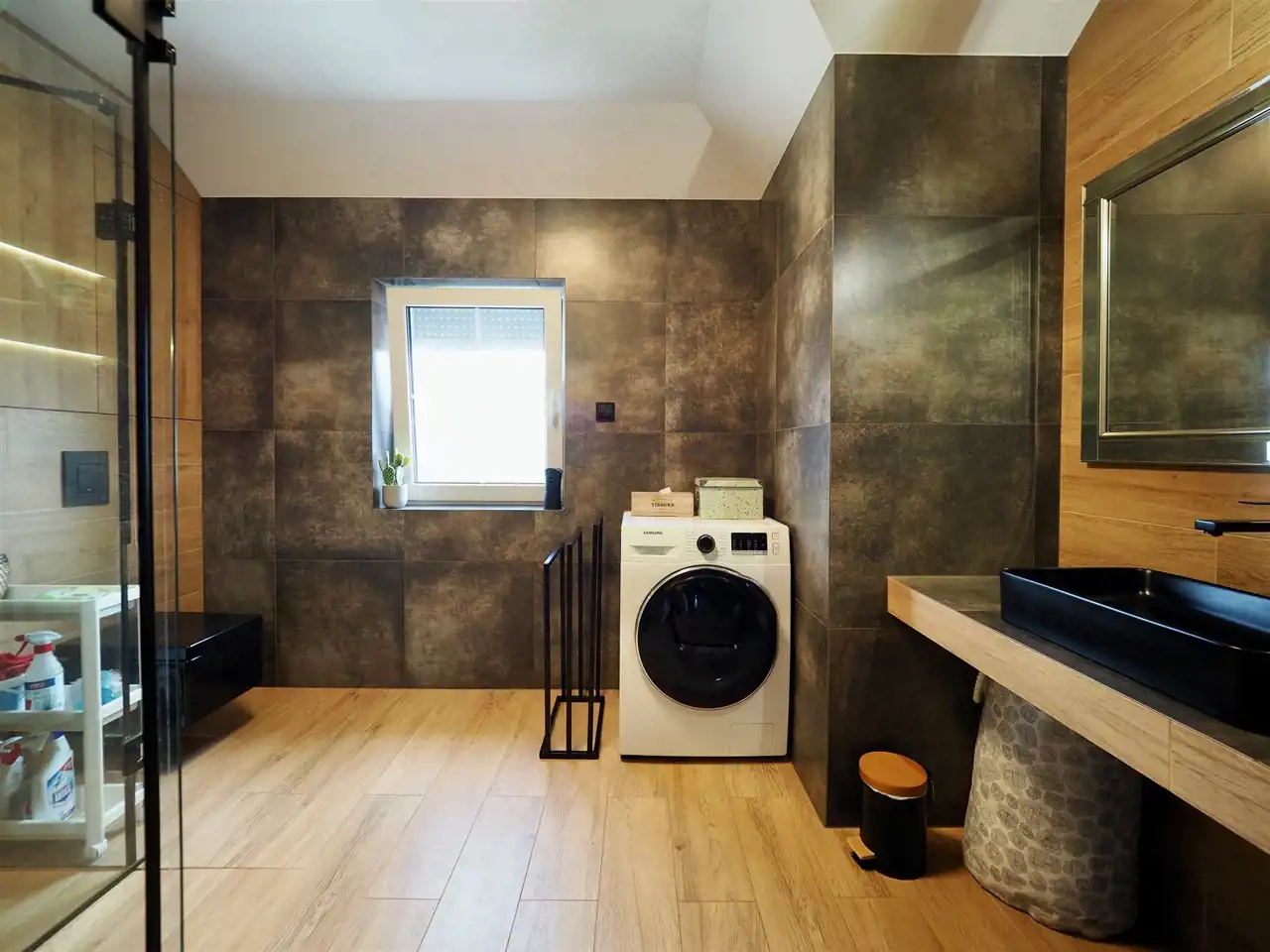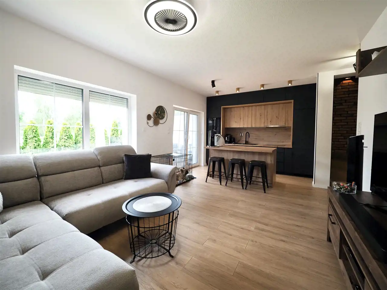 Materiał budowlany pustak ceramiczny 24 cm, ścianki działowe - beton komórkowy 12 cm, strop Teriva, dachówka ceramiczna, podwójna ściana z izolacją akustyczną. Okna trzyszybowe + rolety zewnętrzne i moskitiery. Ogrzewanie pompa ciepła z funkcją chłodzenia C.O. podłogowe - cały dom z garażem włącznie.