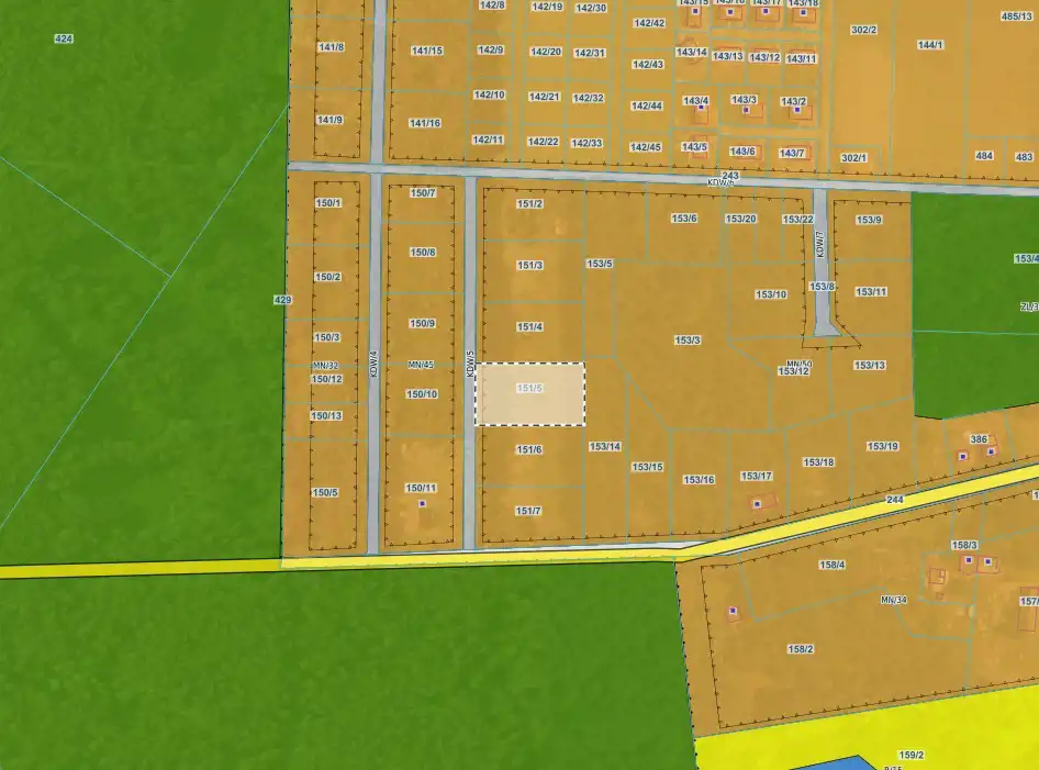- Numer działki: 151/5 + udział w działce drogowej 151/1