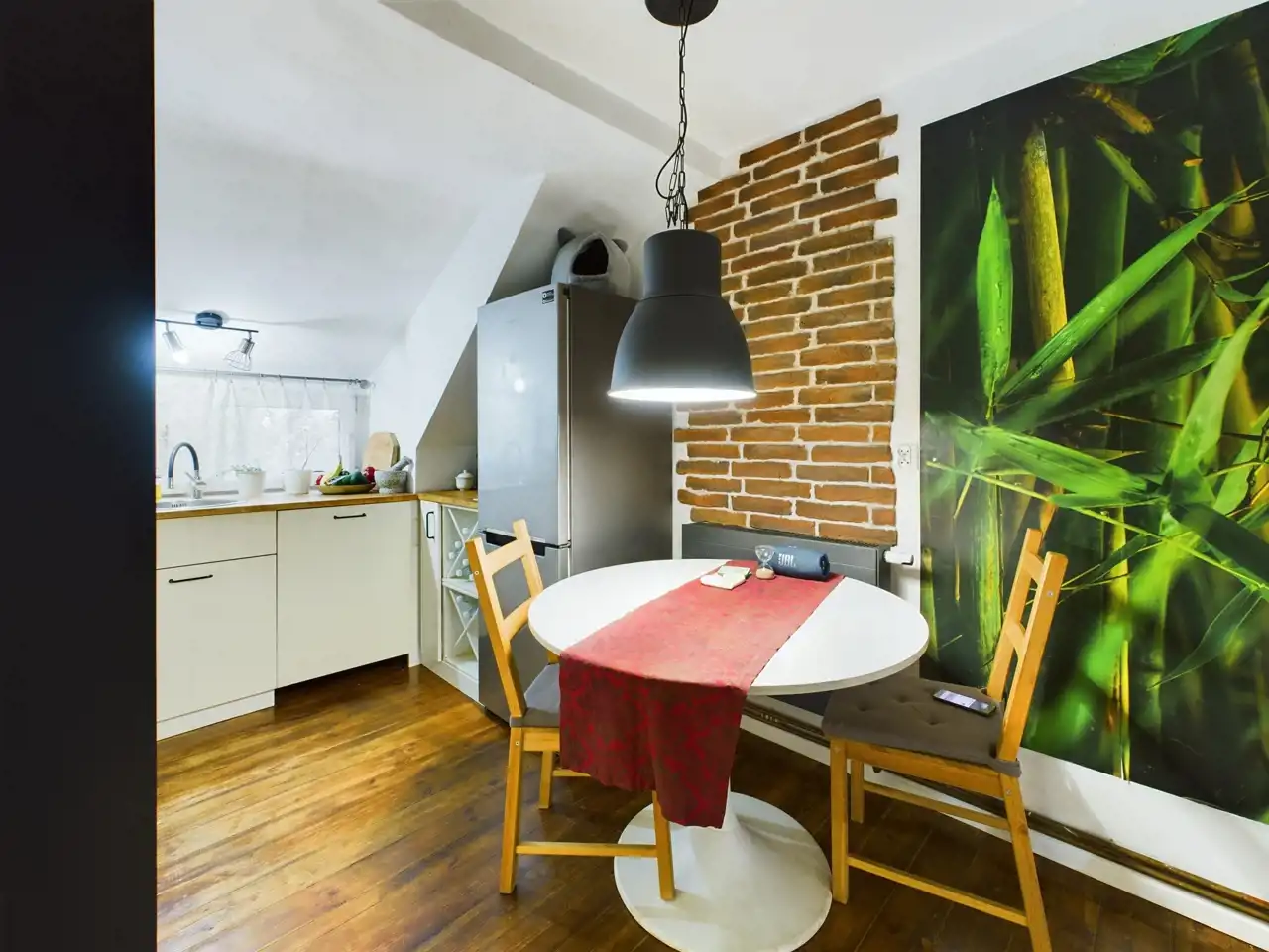 Bardzo funkcjonalny układ obejmuje duża przestrzeń dzienna składająca się z kuchni połączonej z jadalnią, salonu, sypialni wyposażonej w duże łózko oraz pojemną szafę w zabudowie i dobrze doświetlonej łazienki z wygodną wanną.