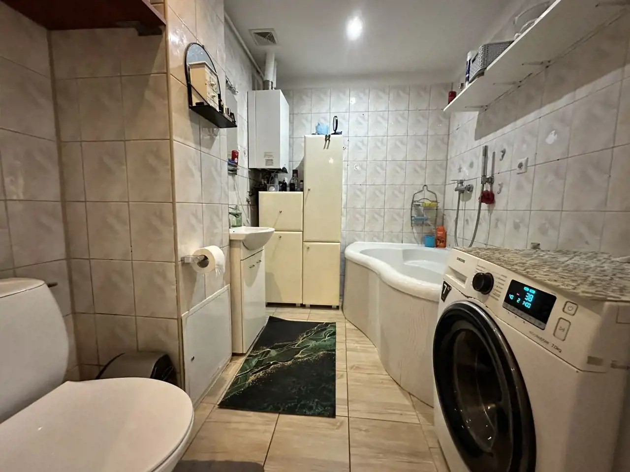 - Łazienka (5 m²) – wykończona w jasnych kaflach, z wanną, umywalką z szafką, dodatkowymi miejscami do przechowywania oraz miejscem na pralkę.