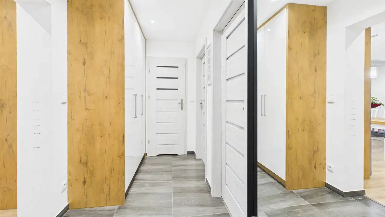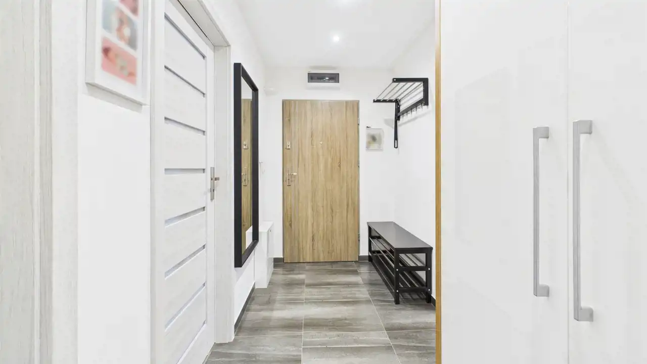 funkcjonalny przedpokój z miejscem na szafę w zabudowie.
