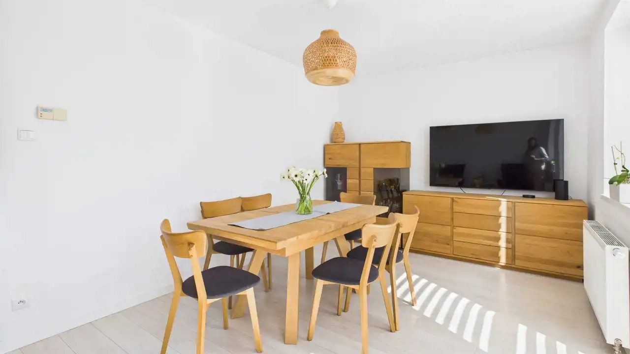 Mieszkanie wykończone z dbałością o detale – nowoczesne materiały, stonowana kolorystyka i funkcjonalne rozwiązania tworzą spójną, przytulną przestrzeń gotową do zamieszkania.
