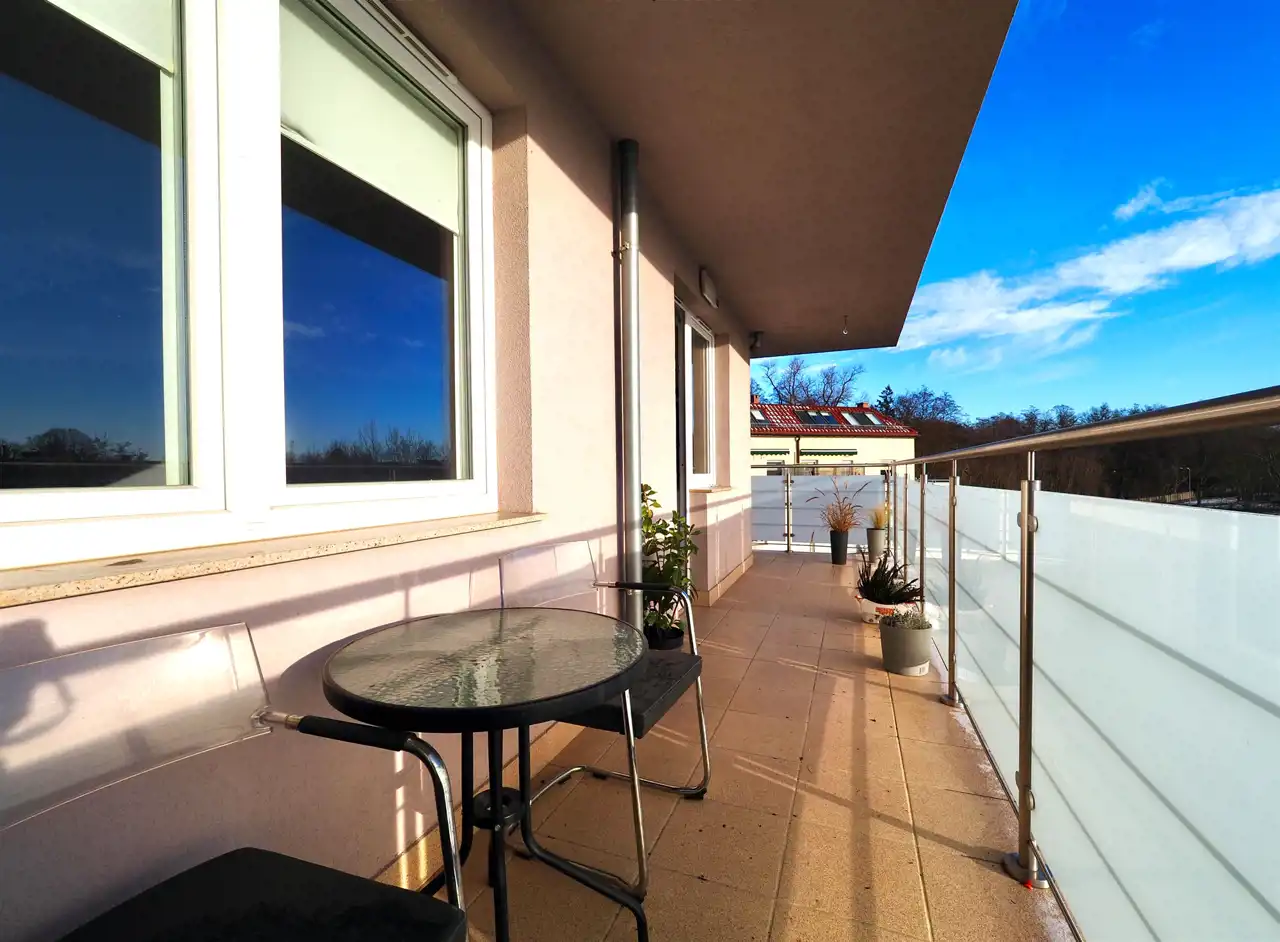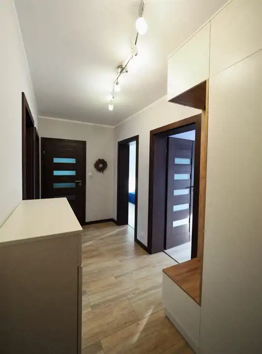 - Salon z balkonem, dwa pokoje, kuchnia, łazienka, korytarz