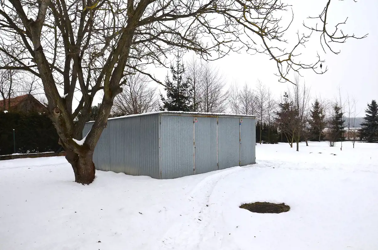 Dodatkowo na posesji są dwa garaże typu blaszak. Teren w całości jest ogrodzony. Brama wjazdowa automatyczna sterowana na pilota.