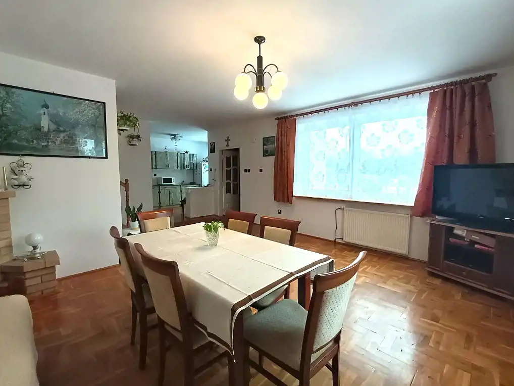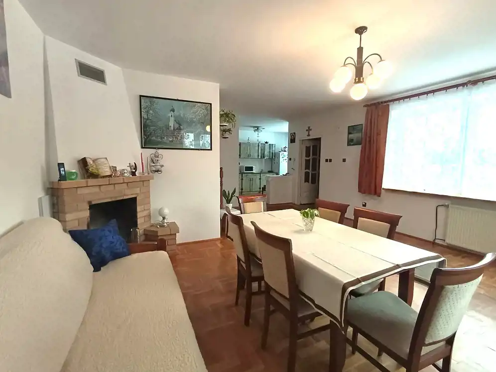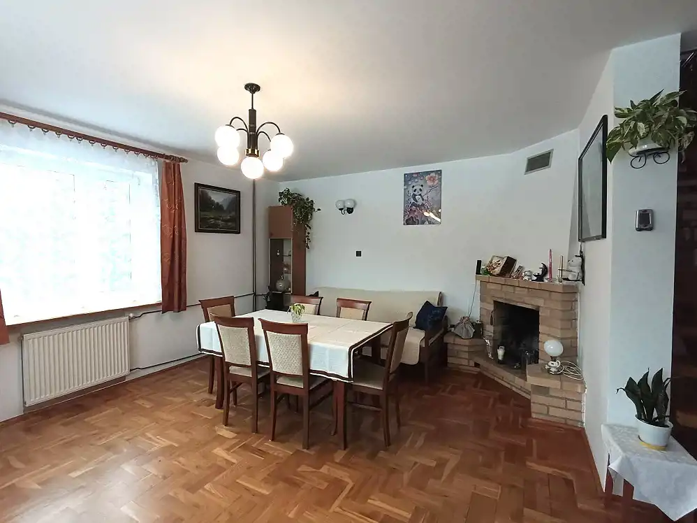 Dom parterowy, z użytkowym poddaszem i garażem w bryle budynku, wybudowany w 1995r. Materiał budowlany pustak (1,5 pustaka, wewnątrz pustka powietrzna). Dach kryty blachą. Okna PCV. Strop betonowy. Na podłogach parkiet. Budynek został zaprojektowany w sposób bardzo przemyślany i nowoczesny jak na swoje czasy. Parter stanowi otwarta, jasna przestrzeń, w której centralnym punktem jest salon z kominkiem połączony z korytarzem i kuchnią. W domu znajduje się również bezpośrednio przejście do garażu, co znacząco zwiększa komfort codziennego użytkowania.
