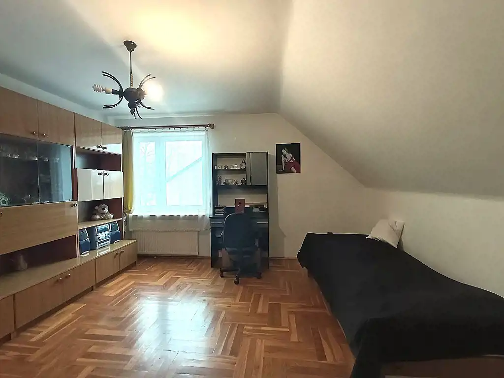 Na poddaszu: trzy sypialnie, w tym jedna z balkonem, garderoba, łazienka z WC, korytarz, klatka schodowa.