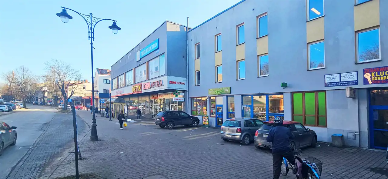 Lokal położony jest w Olkuszu w budynku handlowo-biurowym Skarbek przy ulicy Króla Kazimierza Wielkiego 24, na drugim piętrze. Budynek usytuowany jest w ścisłym centrum Olkusza, zaledwie 600 metrów od głównej trasy Kraków - Katowice .W budynku jest sklep z elektroniką, sklep spożywczy, obok budynku znajdują się Paczkomaty Inpost. Lokal jest do własnej aranżacji. W pobliżu znajdują się szkoły, sklepy, restauracje oraz dworzec kolejowy i autobusowy. Przed budynkiem dostępne są miejsca parkingowe oraz przystanek komunikacji miejskiej.