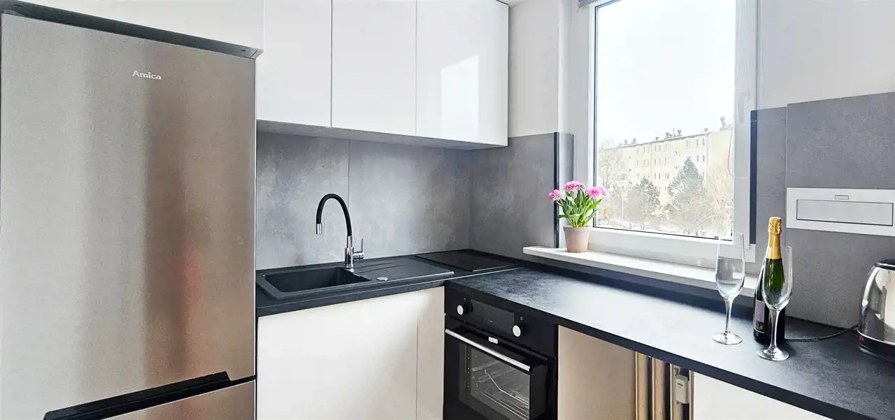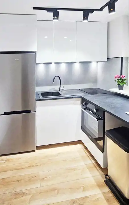 nowe meble kuchenne w zabudowie oraz nowy sprzęt AGD (lodówka, piekarnik, płyta indukcyjna, okap),