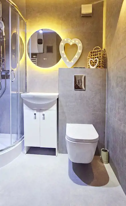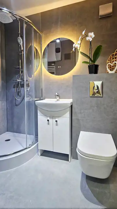 fully renovated bathroom (shower cabin, washbasin with cabinet, toilet),