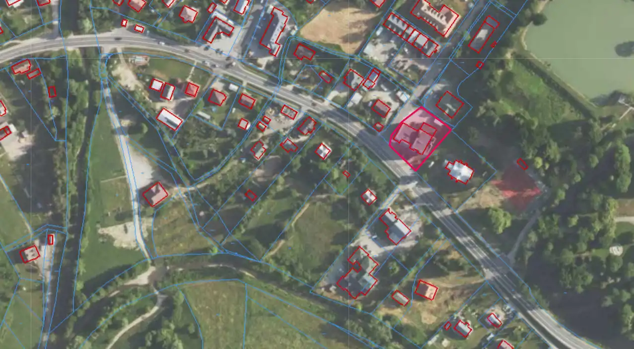 w pierwszym rzędzie zabudowy przy głównej ulicy handlowej