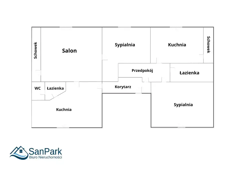 W skład mieszkania wchodzą: salon, dwie sypialnie, dwie kuchnie, dwie łazienki, przedpokój oraz dwa małe schowki, które świetnie sprawdzą się jako spiżarnia lub garderoba. Całość jest funkcjonalna i przyjazna w codziennym użytkowaniu.