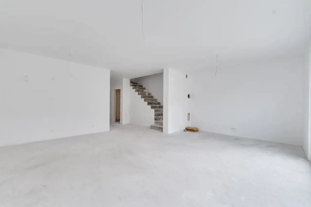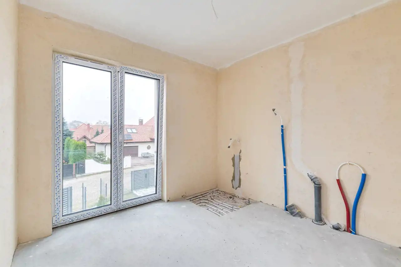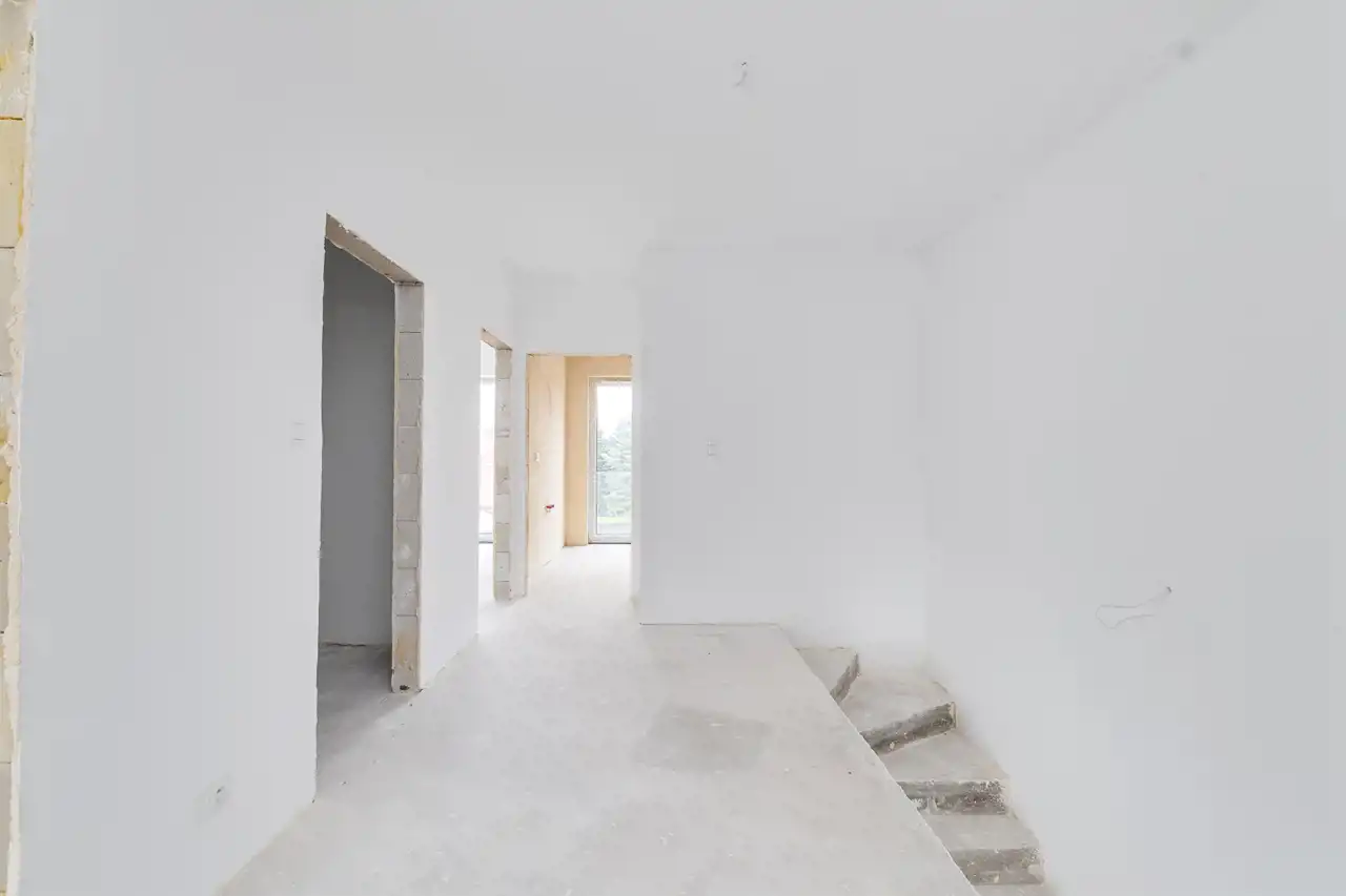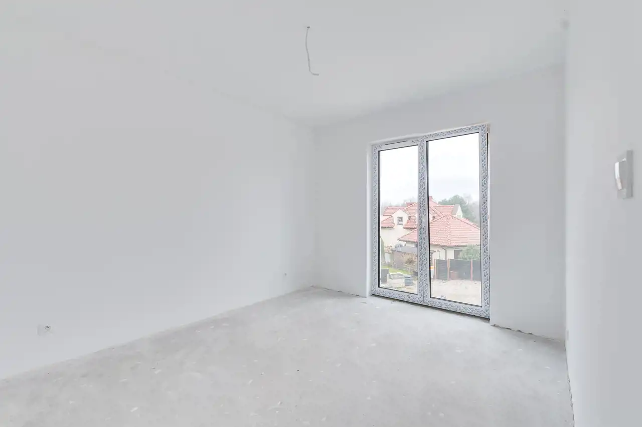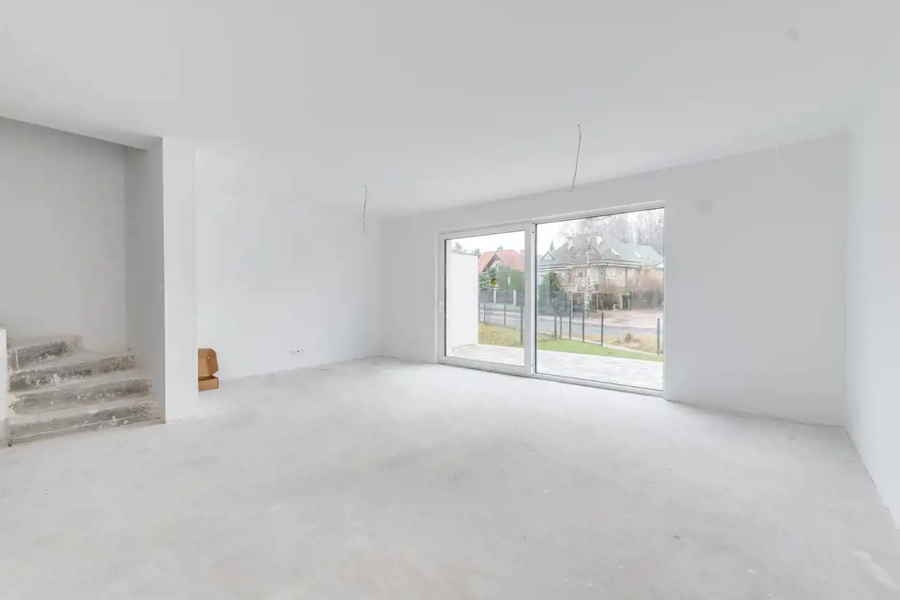 Dom został wzniesiony z trwałego gazobetonu firmy Solbet. Dużą wagę przyłożono do energooszczędności: elewacja docieplona jest 20 cm warstwą styropianu, szczyty – wełną. Wełną również docieplono strop nad poddaszem - 25 cm). Dach pokryty jest estetyczną dachówką cementową, a stolarka okienna to nowoczesne, trzyszybowe pakiety. Duże przeszklenia nadają domowi wyjątkowy klimat - wnętrza są słoneczne i sprawiają wrażenia jeszcze bardziej przestronnych, zwłaszcza wykorzystanie drzwi przesuwnych na parterze, które znacznie powiększają przejście do ogrodu! Wewnątrz dom wymaga wykończenia, posiada duży potencjał aranżacyjny, wszystko zależy od Twojej pomysłowości, możliwości oraz oczekiwań. Komfort cieplny zapewnia piec gazowy Viessmann z zasobnikiem 45L oraz rozprowadzone w całym domu ogrzewanie podłogowe. Wszystkie media (woda, prąd, kanalizacja) są podłączone z sieci miejskiej. W celu zwiększenia wygody zamontowano elektrycznie otwieraną bramę wjazdową. Do nieruchomości doprowadzony jest również światłowód.