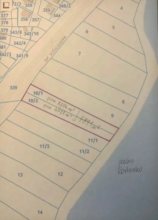 Atrakcyjna działka o pow. 8200 m2 z linią brzegową jez. Kortowskiego. Położona na skraju osiedla Dajtki, przy ul. Włościańskiej. Przyłącza elektryczne, wodne i kanalizacyjne: na działce. Działka ma kształt prostokąta o wymiarach ok. 50m x 174m. Pochylona w kierunku jeziora. Możliwość uzyskania warunków zabudowy. Na działce liczne drzewa owocowe a także kilka okazałych świerków. Murowany i podpiwniczony budynek gospodarczy, do remontu lub usunięcia. Obecnie zarośnięta samosiejkami. W okolicy bogata infrastruktura handlowa, usługowa i rekreacyjna (oprócz jez. Kortowskiego, w odległości 400 m. znajduje się centrum rekreacyjne Ukiel, nad jez. Ukiel. Bezproblemowa komunikacja ze ścisłym centrum miasta. Do Ratusza 10 min. samochodem. Duża powierzchnia działki umożliwia budowę zarówno okazałej rezydencji jak i mniejszego domu z dużym ogrodem i terenem rekreacyjnym. Nieruchomość składa się z dwu wydzielonych,prawie jednakowych działek o pow. ok. 4100m2 każda. Możliwość zakupu całości, lub jednej z działek za połowę ceny.