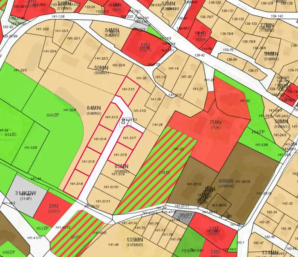 Przedmiotowe działki położone są na terenie objętym ustaleniami „Miejscowego planu zagospodarowania przestrzennego osiedla Gutkowo, zlokalizowanego między linią kolejową a ulicami Kanarkową, Basieńki i Rzędziana w Olsztynie” (Uchwała Rady Miasta Olsztyna Nr VI/97/19 z dnia 27 marca 2019 r.) i oznaczone są symbolami: 55MN1 – działka 31/1; 84MN2 – działki 31/3, 31/4, 31/5, 31/6; 85MN2 – działki 31/7 i 31/8. Przeznaczenie ww. terenów: zabudowa mieszkaniowa jednorodzinna wolnostojąca. Obsługa komunikacyjna ww. nieruchomości powinna odbywać się zgodnie z ustaleniami miejscowego planu zagospodarowania przestrzennego, przez działkę nr 31/13, obr. 141, oznaczoną w ww. miejscowym planie symbolem 241KDD12 – drogi publiczne, która stanowi teren nieurządzony.