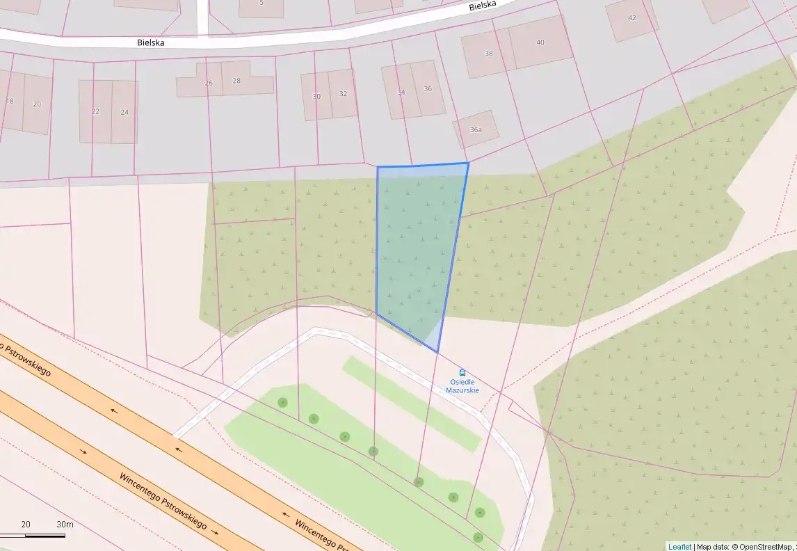Działka położona w urokliwej okolicy osiedla Mazurskiego, przy ul. Bielskiej z dojazdem od strony Pstrowskiego w Olsztynie.