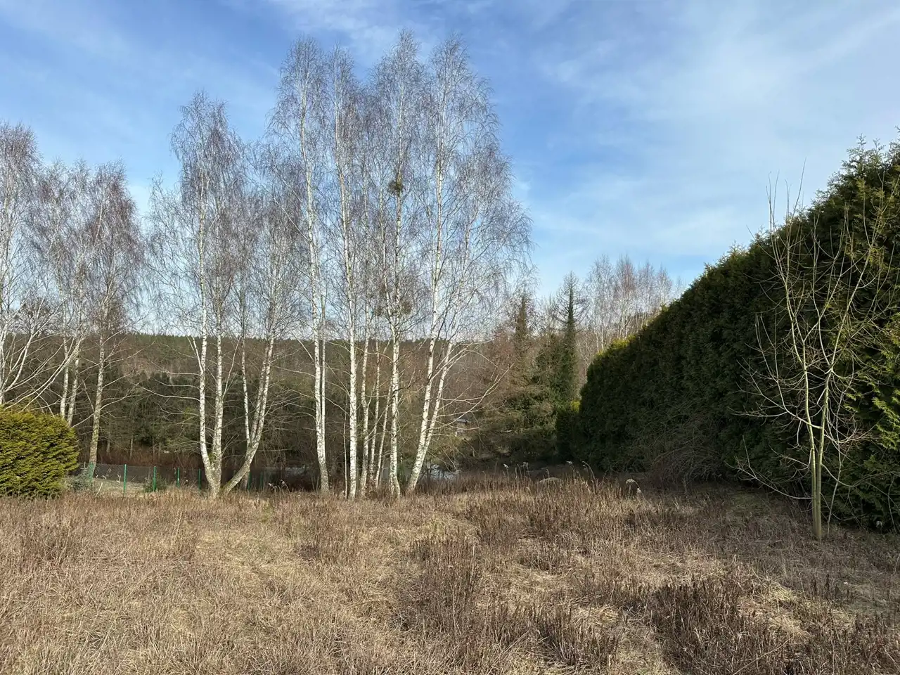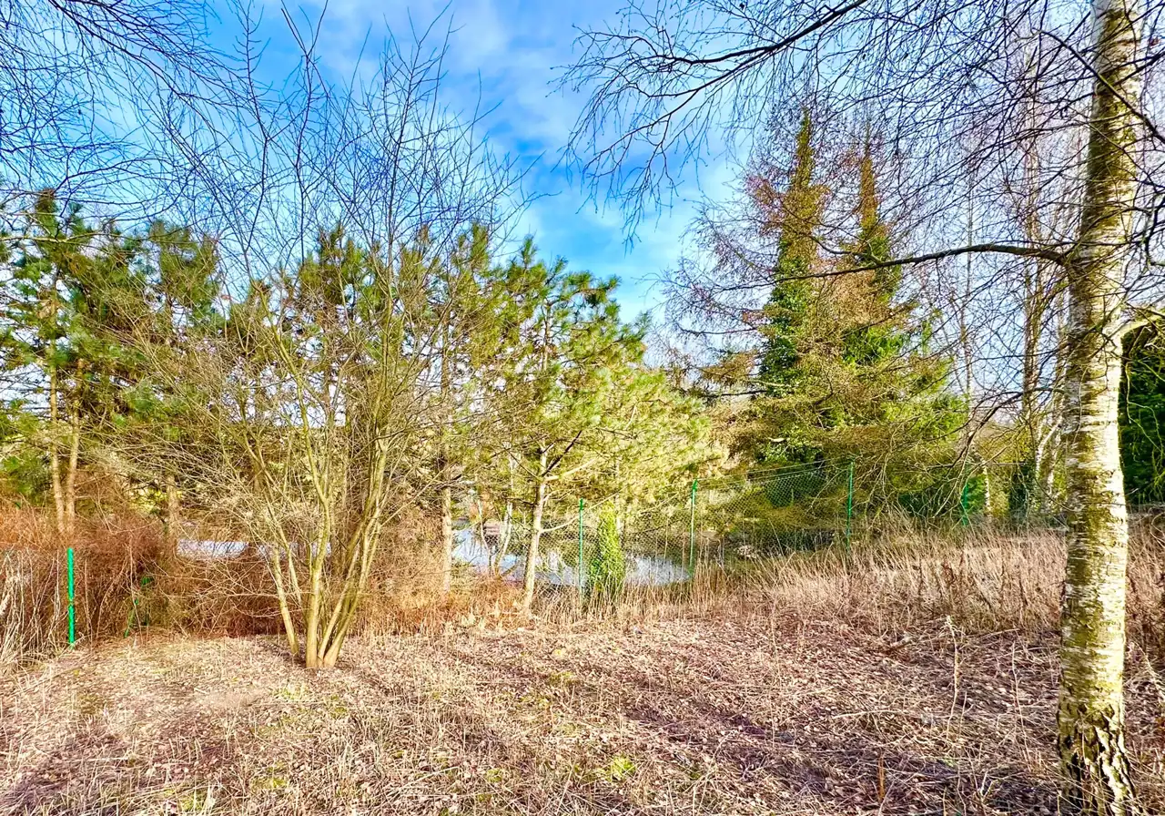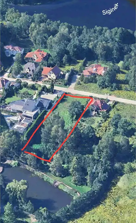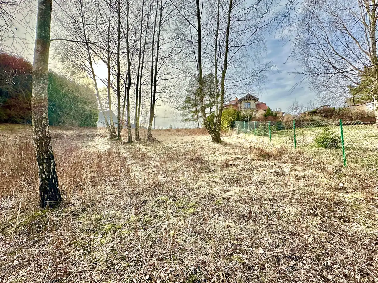 Prostokątna parcela,od strony ulicy płaska, opada dalej w stronę sąsiadującego z nią niewielkiego jeziorka. Teren częściowo zadrzewiony, ogrodzony siatką metalową.