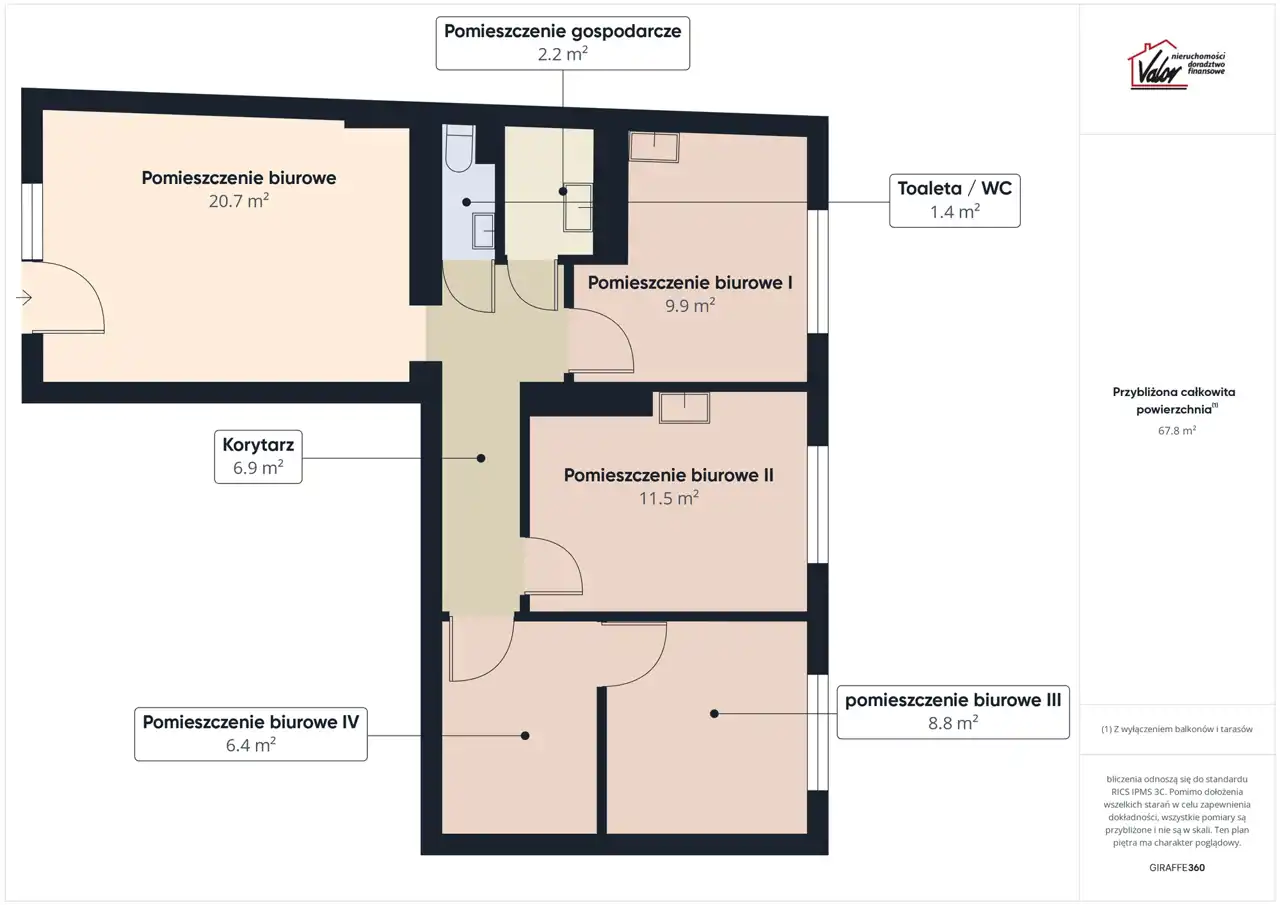 Lokal biurowy o powierzchni użytkowej 67,80 m2, składa się z: