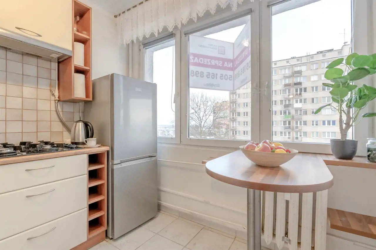 W kuchni znajduje się zabudowa kuchenna ze sprawnymi sprzętami AGD. W przedpokoju i w sypialni funkcjonalne szafy wnękowe.