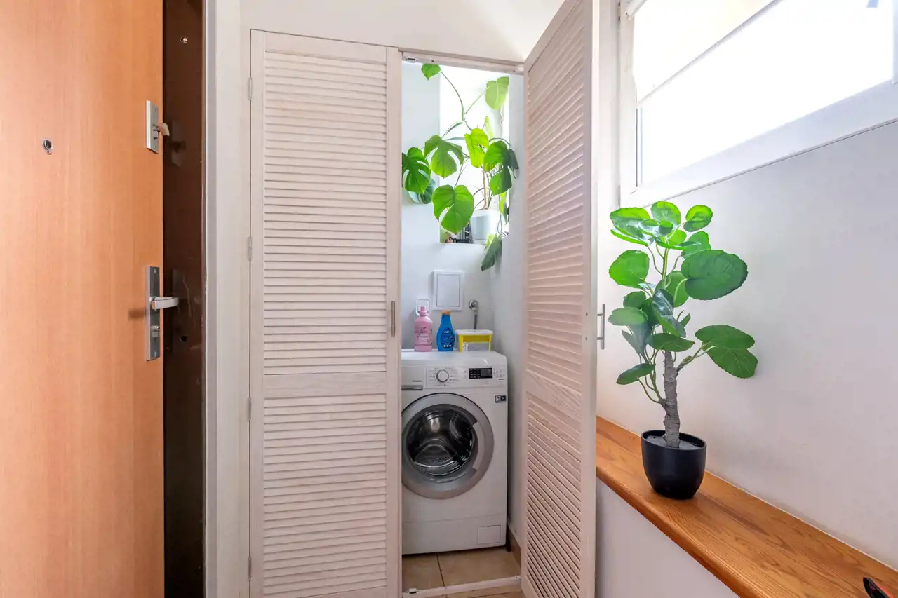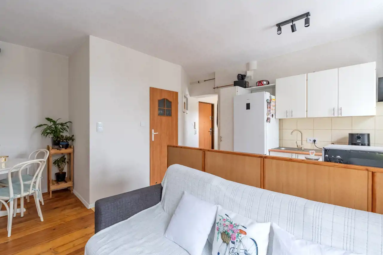 Na powierzchnię użytkową składa się przedpokój z dużą wnęką, pełniącą funkcję pomieszczenia gospodarczego z nowymi drewnianymi drzwiami. Z przedpokoju przechodzimy do słonecznego salonu z aneksem kuchennym oddzielonym barkiem oraz wnęką na stół kuchenny. Z salonu przechodzimy do sypialni z DUŻĄ GARDEROBĄ. Łazienka wyposażona w prysznic.