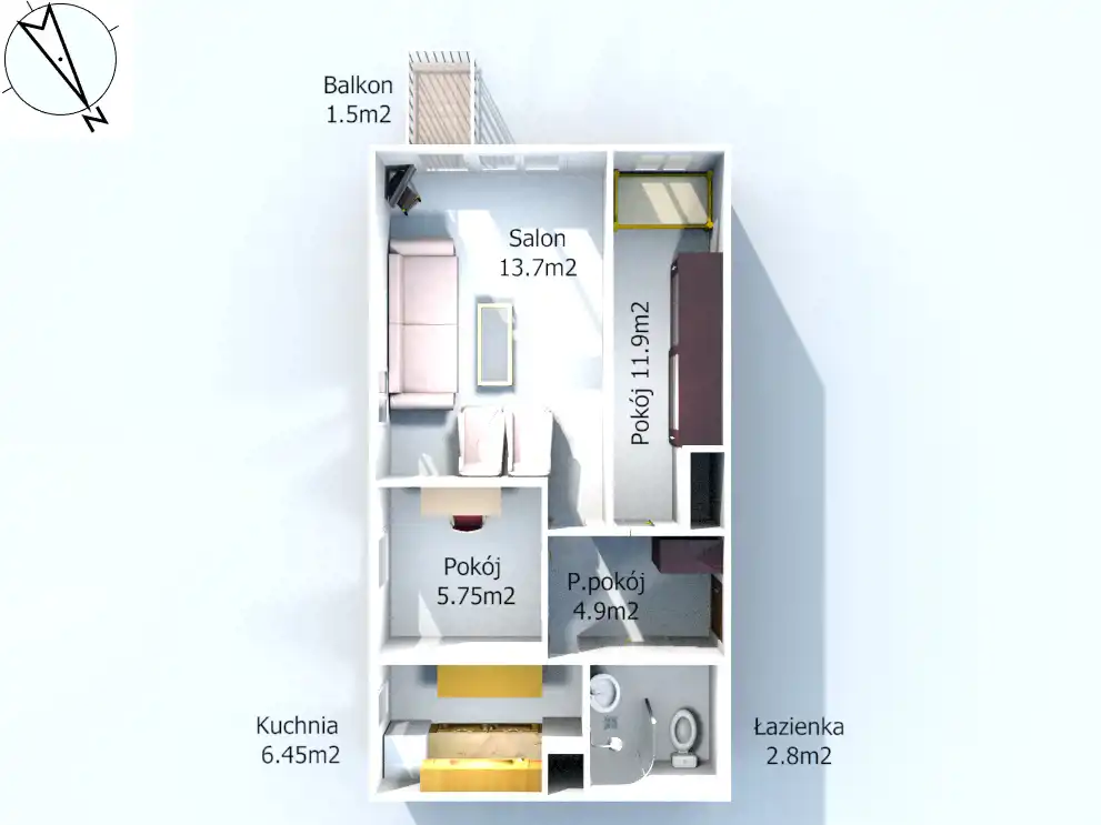 Rozkład mieszkania oraz strony świata zostały przedstawione na rzucie 3D.