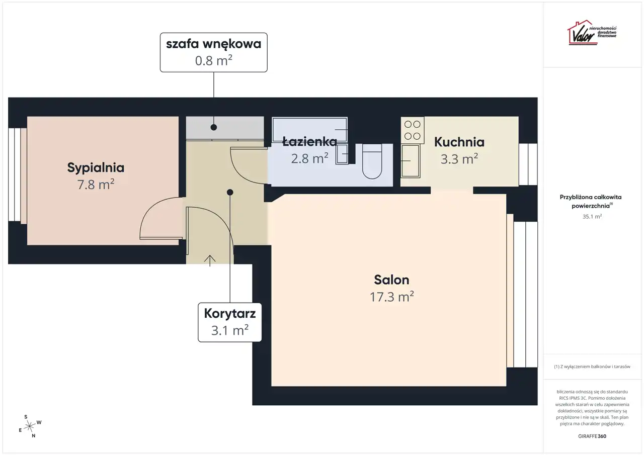 - Przedpokój z szafą wnękową o powierzchni 3,1 m²,