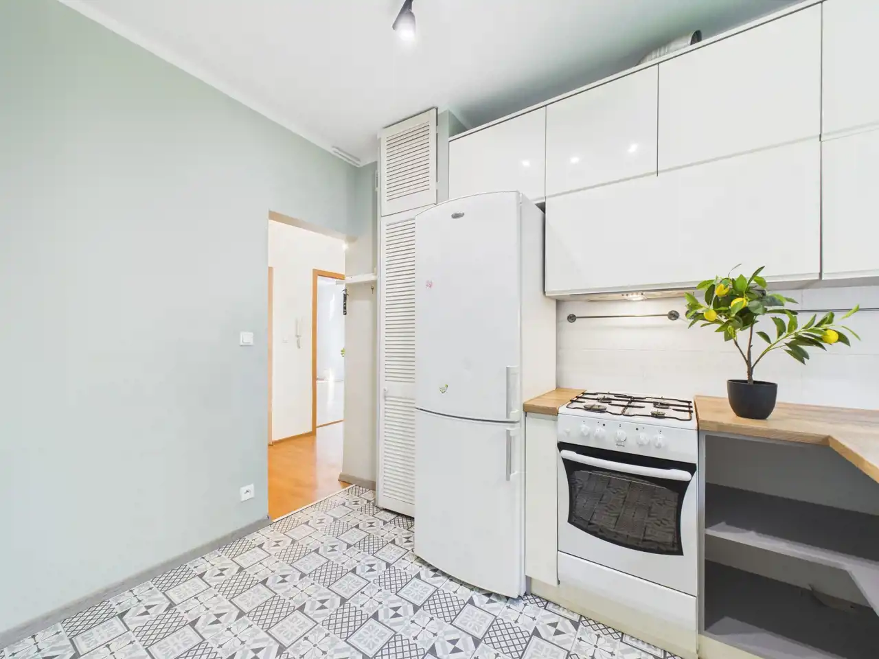 Kuchnia wykończona w nowoczesnym neutralnym stylu, wyposażona w niezbędne sprzęty.