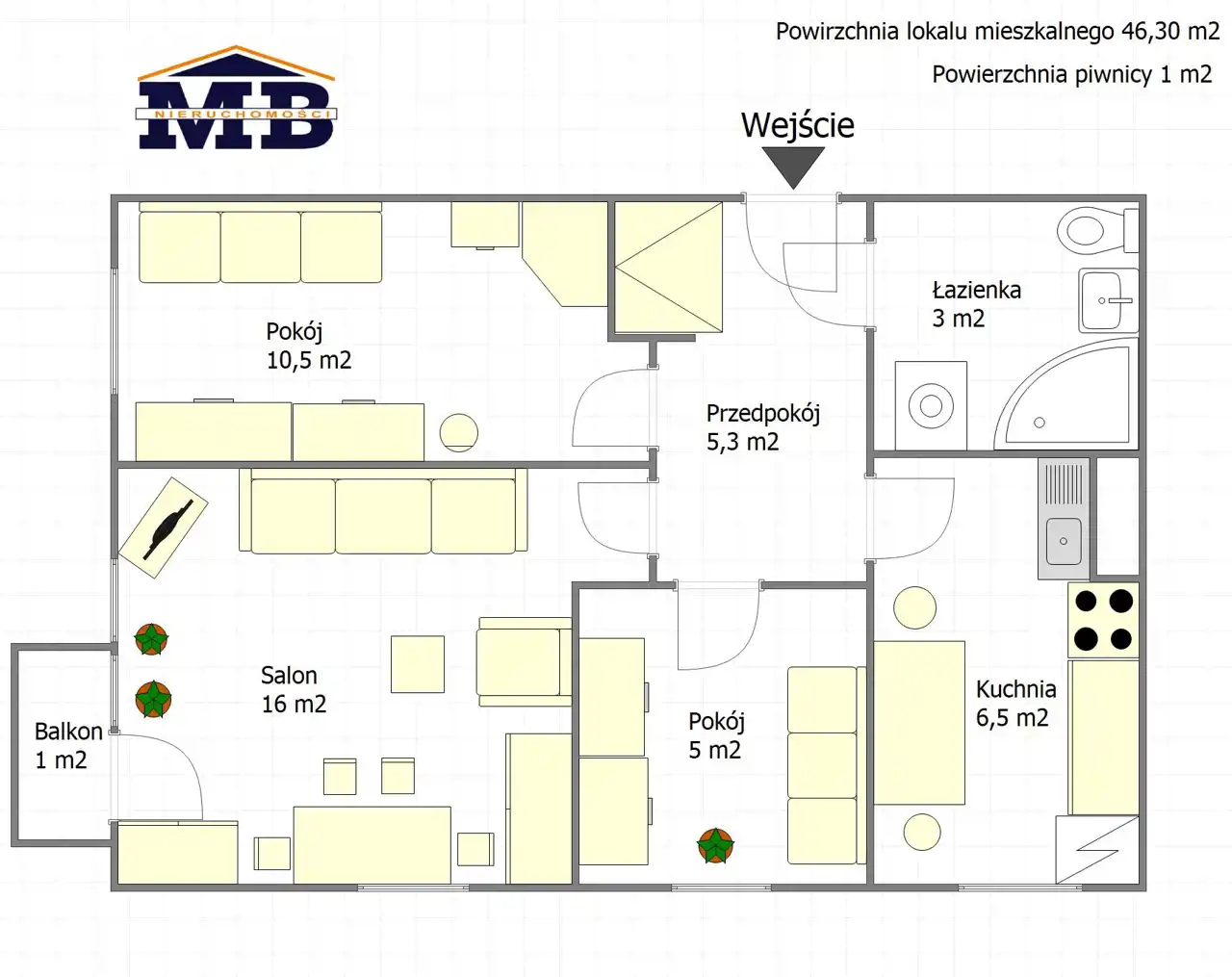 - Charakterystyka mieszkania 46.3 m2, 3 pokoje
