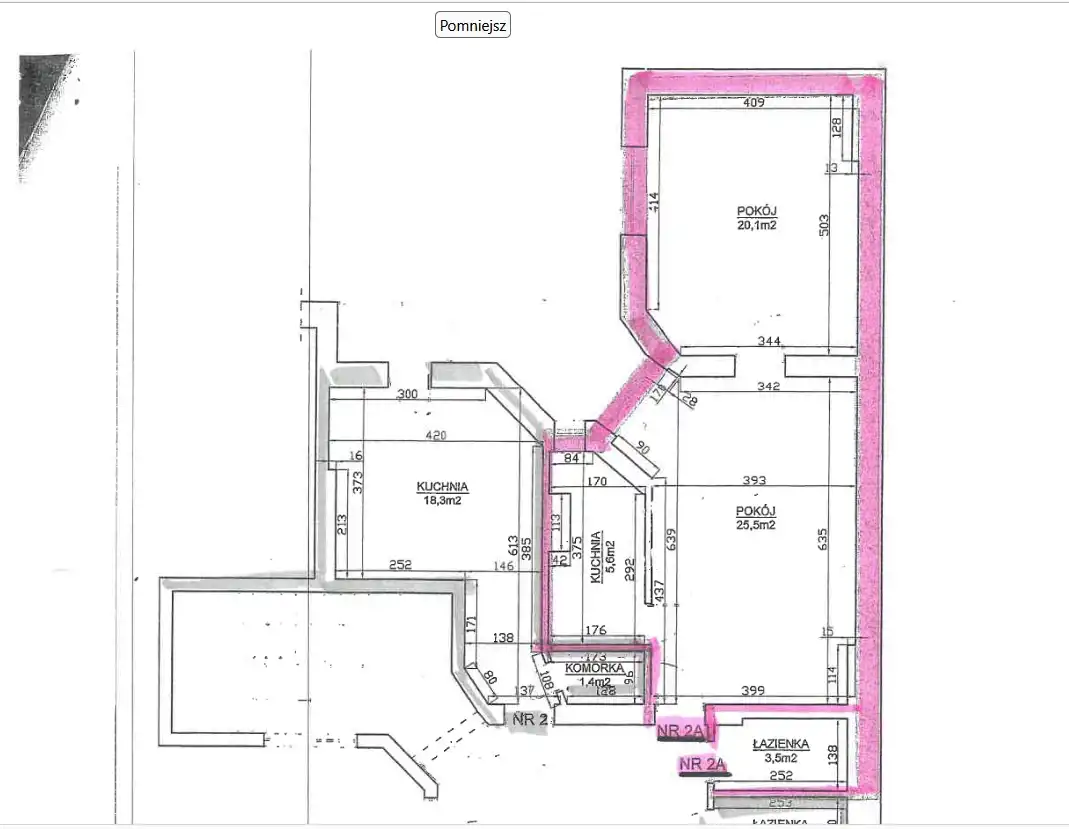 Powierzchnia użytkowa lokalu wynosi 54,7 m². W skład lokalu wchodzą: 2 pokoje (jeden przejściowy), kuchnia, łazienka. Łazienka z oddzielnym wejściem z korytarza wspólnego dla lokali 2a i 2. Korytarz stanowi części wspólne budynku. Lokal wymaga prac remontowo-naprawczych.